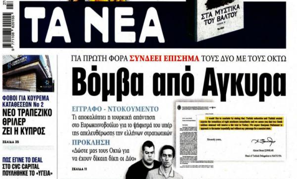 Τέλος, δεν πρέπει να ξεχνάμε την αποκάλυψη επιστολής της Αγκυρας προς τον πρόεδρο της Ευρωκοινοβουλίου, Αντ. Ταγιάνη με την οποία ζητούσε επίσημα την έκδοση των 8 Τούρκων και τη συνέδεε με τους Μητρετώδη και Κούκλατζη.