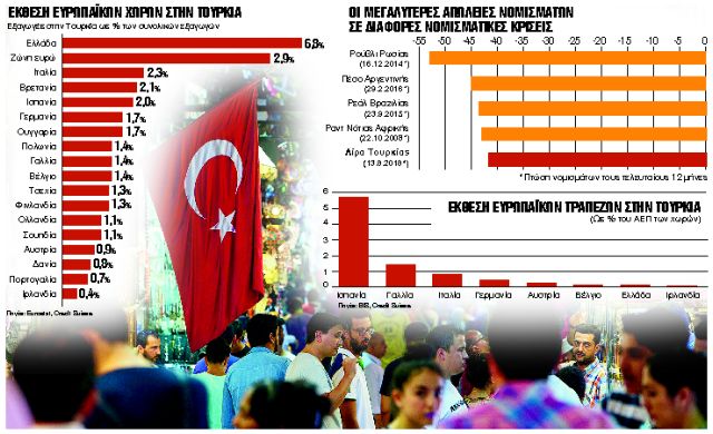 Η Ελλάδα μάλιστα με βάση τις εξαγωγές της προς την Τουρκία ως ποσοστό των συνολικών της εξαγωγών (7%) εμφανίζεται η περισσότερο εκτεθειμένη στη γείτονα από το σύνολο των χωρών της ευρωζώνης. Αν μάλιστα η Τουρκία εισέλθει σε ύφεση, το εμπορικό πλεόνασμα της Ελλάδας στο ισοζύγιο εισαγωγών-εξαγωγών με την Τουρκία κινδυνεύει έτσι να ανατραπεί. Παράλληλα, οι τουρκικές επενδύσεις στο ελληνικό real estate στο πλαίσιο και του προγράμματος «χρυσή βίζα» αναμένεται (για αυτούς τουλάχιστον που δεν έχουν βγάλει τα λεφτά τους στο εξωτερικό) να «παγώσουν».
