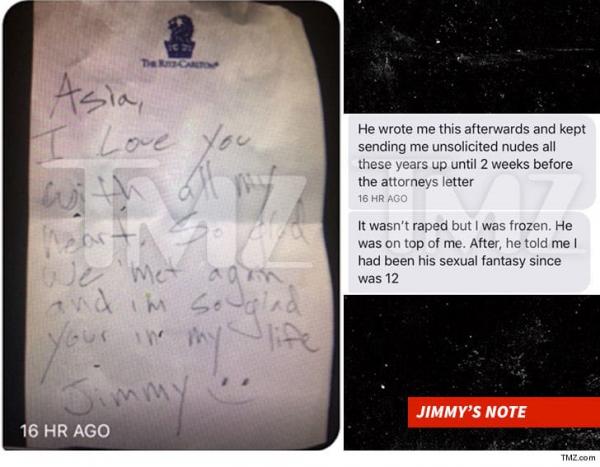 «Δεν ήταν βιασμός, αλλά ήμουν παγωμένη. Εκείνος ήταν από πάνω μου. Αργότερα μου είπε ότι είχε σεξουαλικές φαντασιώσεις μαζί μου από 12 ετών», φέρεται να γράφει σε μήνυμα το οποίο εικάζεται ότι παραλήπτης του ήταν ο Άντονι Μπουρντέν, ενώ στο ίδιο μήνυμα περιλαμβάνει και φωτογραφία με το σημείωμα που φέρεται να της είχε δώσει ο 17χρονος τότε Τζίμι Μπένετ.