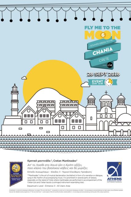 Τα Χανιά «ταξιδεύουν» στο Αεροδρόμιο της Αθήνας, την Παρασκευή 28 Σεπτεμβρίου 2018, στο πλαίσιο της δράσης Fly me to the Moon 6. Οι ταξιδιώτες και οι επισκέπτες θα απολαύσουν ένα μοναδικό πλούσιο πρόγραμμα, που περιλαμβάνει μουσική και χορούς από παραδοσιακό κρητικό συγκρότημα και χορευτές, μαντινάδες και «διάλογο» μεταξύ κοινού και πρωτοχορευτή και στιγμές χανιώτικης γαστρονομίας, με ντόπια προϊόντα και εισαγωγή στα μυστικά της προετοιμασίας του παραδοσιακού ντάκου!