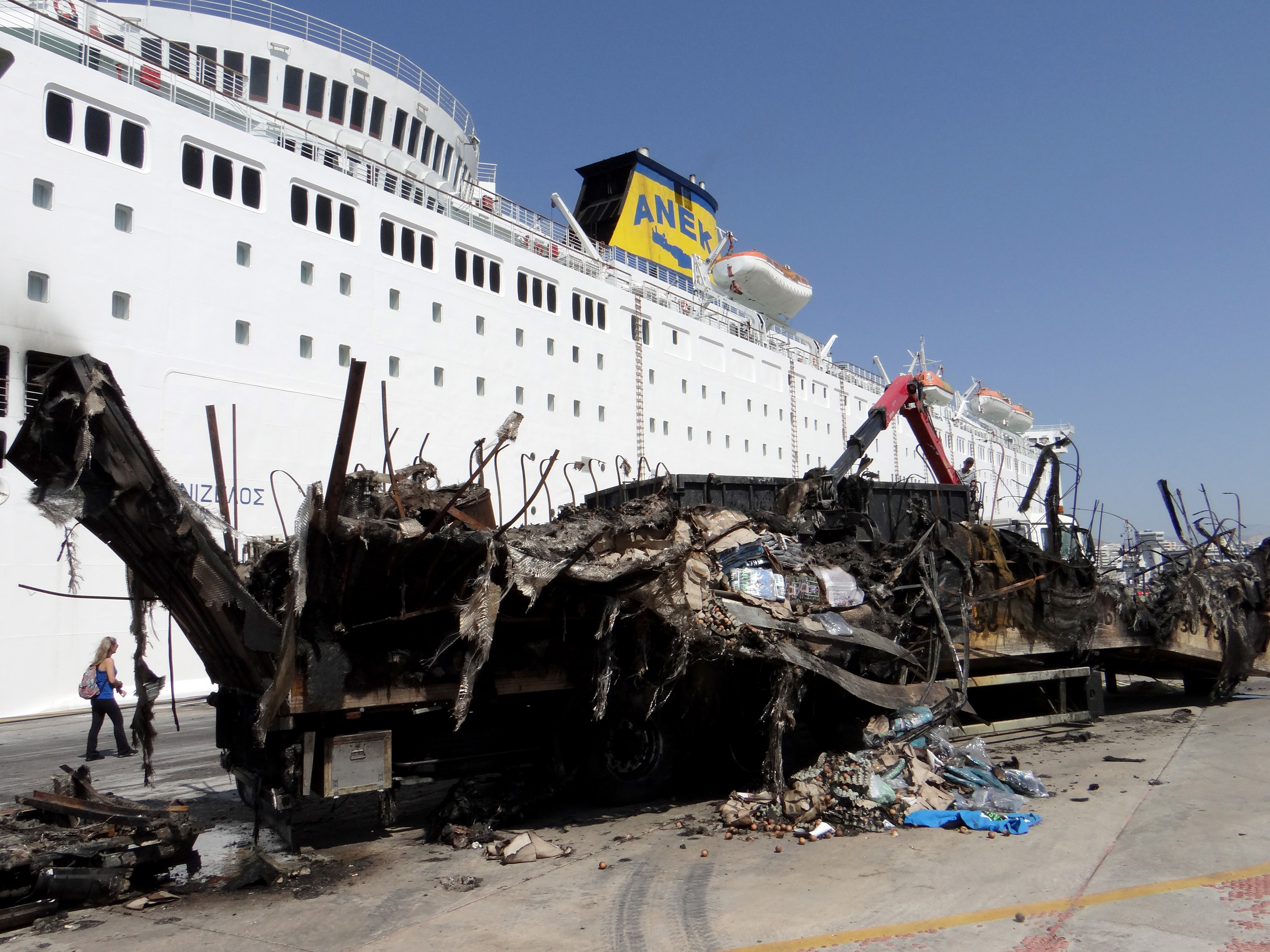 Τα συνεργεία απομακρύνουν τα αποκαΐδια, αλλά και τα ελάχιστα εναπομείνατα οχήματα, προκειμένου το πλοίο να αποπλεύσει με προορισμό τα ναυπηγεία στο Πέραμα, προς επισκευή.