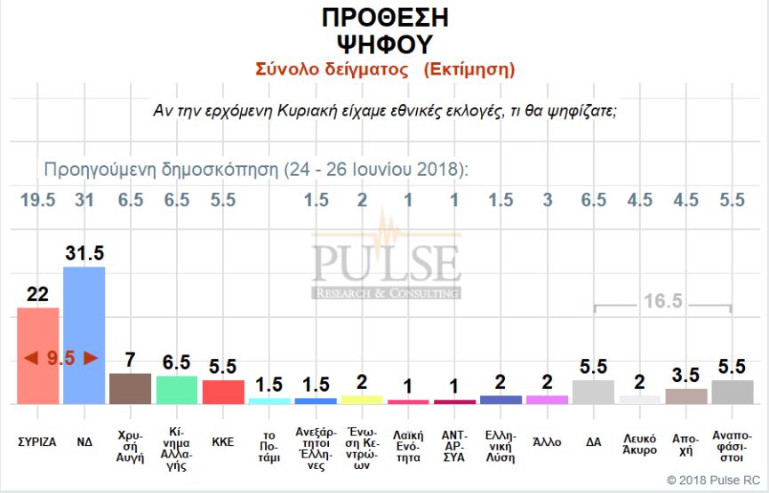 Ειδικότερα, στην δημοσκόπηση της Pulse για τον ΣΚΑΪ, που διεξήχθη τηλεφωνικά από τις 16 έως τις 18 Σεπτεμβρίου 2018, στο ερώτημα της πρόθεσης ψήφου η Νέα Δημοκρατία συγκέντρωσε ποσοστό 31,5% έναντι 22% του ΣΥΡΙΖΑ. Τρίτη η Χρυσή Αυγή με 7%, το Κίνημα Αλλαγής ακολουθεί με 6,5% και το ΚΚΕ με 5,5% ολοκληρώνει τα κόμματα που «μπαίνουν» στη Βουλή.