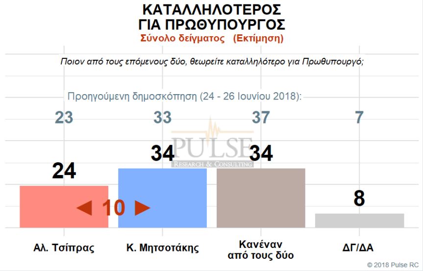 Διψήφιο είναι το προβάδισμα που καταγράφει ο πρόεδρος της Νέας Δημοκρατίας, Κυριάκος Μητσοτάκης έναντι του Αλέξη Τσίπρα στο ερώτημα για το ποιος είναι καταλληλότερος για πρωθυπουργός.