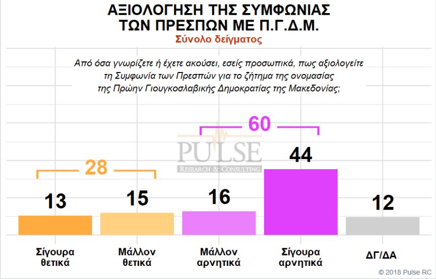 Στο μεγάλο θέμα, πολιτικού ενδιαφέροντος, τη Συμφωνία των Πρεσπών για την ονομασία της πΓΔΜ, το 60% των ερωτηθέντων αξιολογεί αρνητικά (Μάλλον / Σίγουρα) τους χειρισμούς της κυβέρνησης, με ένα ποσοστό 28% να κρίνει θετικά (Μάλλον / Σίγουρα).