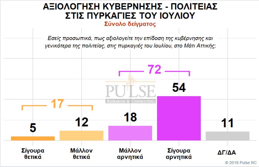 Συγκεκριμένα, στο ερώτημα για την αντιμετώπιση των πυρκαγιών του Ιουλίου από την κυβέρνηση, ένα ποσοστό 72% την αξιολογεί αρνητικά (Μάλλον / Σίγουρα), την ώρα που μόλις το 17% την αξιολογεί θετικά (Μάλλον / Σίγουρα).