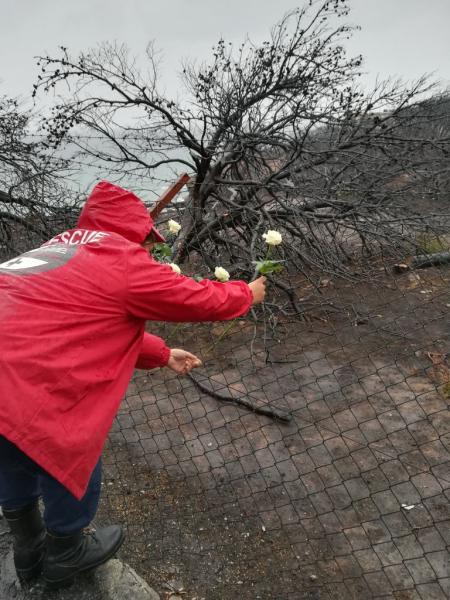 Πέρα από την μεταφορά των αγαθών τα μέλη της ομάδας προχώρησαν και σε μια συμβολική κίνηση. Βρέθηκαν στο σημείο όπου εντοπίστηκαν απανθρακωμένοι οι 26 συνάνθρωποι μας και κατέθεσαν μία ανθοδέσμη ως ελάχιστο φόρο τιμής στα δεκάδες θύματα της πρωτοφανούς αυτής τραγωδίας.