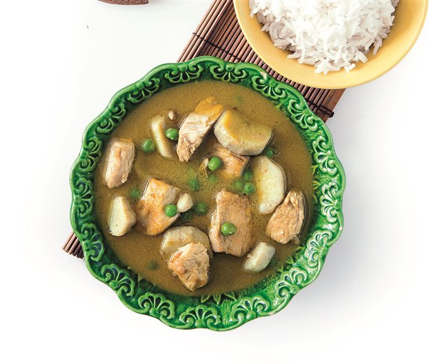 Ρίχνουμε τον ζωμό κότας και το γάλα καρύδας. Αφήνουμε τη σούπα να πάρει βράση, χαμηλώνουμε τη φωτιά και σιγοβράζουμε για 15 λεπτά. Προσθέτουμε τον αρακά και δυναμώνουμε τη φωτιά ώσπου να πάρει βράση. Κατόπιν χαμηλώνουμε ξανά την ένταση της φωτιάς, αλατοπιπερώνουμε κατά βούληση και αφήνουμε τη σούπα να σιγοβράσει για ακόμη 6-7 λεπτά. Σερβίρουμε σε μπολ, συνοδεύοντας με ρύζι μπασμάτι.