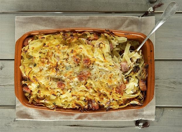 Σε ένα μεγάλο τηγάνι ζεσταίνουμε το ελαιόλαδο, ρίχνουμε το κρεμμύδι και το αφήνουμε να γυαλίσει, χωρίς να πάρει πολύ χρώμα. Προσθέτουμε το σύγκλινο, ανακατεύουμε για 3-4 λεπτά και ρίχνουμε το μείγμα στις χυλοπίτες. Ρίχνουμε τα υπόλοιπα υλικά, ανακατεύουμε καλά και τα αδειάζουμε σε ένα πυρίμαχο σκεύος. Ψήνουμε για 20 λεπτά και σερβίρουμε με μια πράσινη σαλάτα.