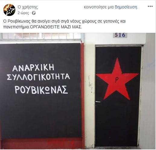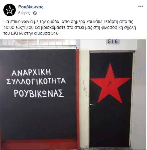 Όπως αναφέρεται στην ανάρτηση, την οποία ανέβασε πρώτος ο Ρουβίκωνας και αναδημοσίευσε το στέλεχος της οργάνωσης, απευθύνεται πρόσκληση «οργανωθείτε μαζί μας», αφού «θα ανοίγει σιγά σιγά νέους χώρους σε γειτονιές και πανεπιστήμια», ενώ ειδικά για τη Φιλοσοφική Σχολή, το μέλος του Ρουβίκωνα αναφέρει ότι κάθε Τετάρτη από τις 10 το πρωί έως τη μιάμιση το μεσημέρι «για επικοινωνία με την ομάδα», «θα βρισκόμαστε στο στέκι μας στη Φιλοσοφική».
