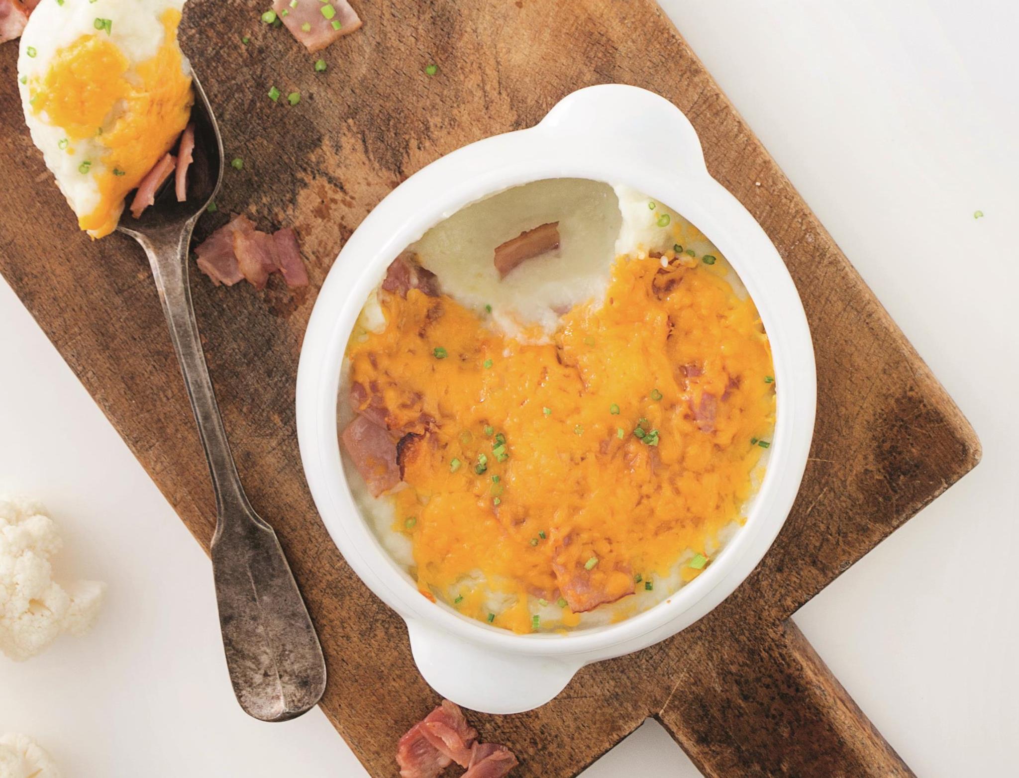 Μεταφέρουμε τον πουρέ σε πυρίμαχο σκεύος, πασπαλίζουμε με το τσένταρ και το μπέικον και ψήνουμε στον φούρνο για περίπου 5 λεπτά, μέχρι να λιώσει το τυρί. Σερβίρουμε αμέσως, γαρνίροντας με το σχοινόπρασο.