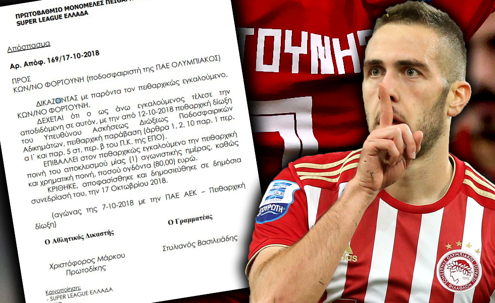 Την ποινή της μιας αγωνιστικής επέβαλε η πειθαρχική επιτροπή της Σούπερ Λίγκα στον Κώστα Φορτούνη, όπως ανακοινώθηκε κι επίσημα από την διοργανώτρια αρχή του πρωταθλήματος.