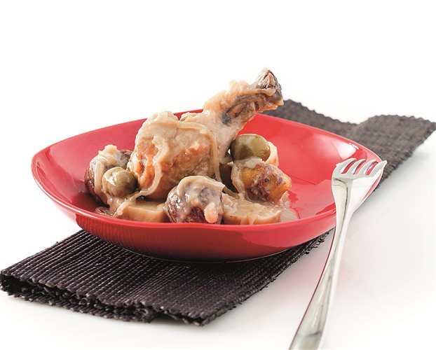 Το βγάζουμε σε μια πιατέλα και στο ίδιο λάδι σοτάρουμε το κρεμμύδι μέχρι να γυαλίσει. Σβήνουμε με το κρασί και μόλις εξατμιστεί το αλκοόλ, επαναφέρουμε τα μπούτια του κοτόπουλου στην κατσαρόλα και προσθέτουμε τις γλυκοπατάτες, τις ελιές και τα κάστανα. Ρίχνουμε τόσο ζωμό όσο να φτάσει 1 δάχτυλο κάτω από τα υλικά, προσθέτουμε τους γλυκάνισους και χαμηλώνουμε τη φωτιά. Αφήνουμε το φαγητό να σιγομαγειρευτεί για περίπου 1½ ώρα και αν χρειαστεί προσθέτουμε υγρά κατά τη διάρκεια του μαγειρέματος.