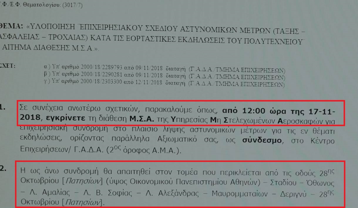 Σύμφωνα με το έγγραφο που παρουσιάζει “Το Βήμα” τα μη επανδρωμένα σκάφη της Αστυνομίας θα πετούν- πάνω από τις οδούς Πατησίων, Σταδίου, Βασιλίσσης Σοφίας και άλλες ενώ θα υπερίπτανται του Πολυτεχνείου και της ΑΣΟΕΕ για την παρακολούθηση τυχόν επεισοδίων. Μάλιστα προβλέπεται η ύπαρξη αξιωματικού της ΕΛ.ΑΣ αρμόδιου για τη πλοήγηση των drones στο επιχειρησιακό κέντρο της Αθήνας ώστε να δίνονται εντολές για τη πορεία τους και τη μεταφορά αντίστοιχης εικόνας και από άλλα σημεία της Αθήνας. Οι πτήσεις των μη επανδρωμένων αεροσκαφών θα ξεκινήσει από τις 12 το μεσημέρι της 17ης Νοεμβρίου.