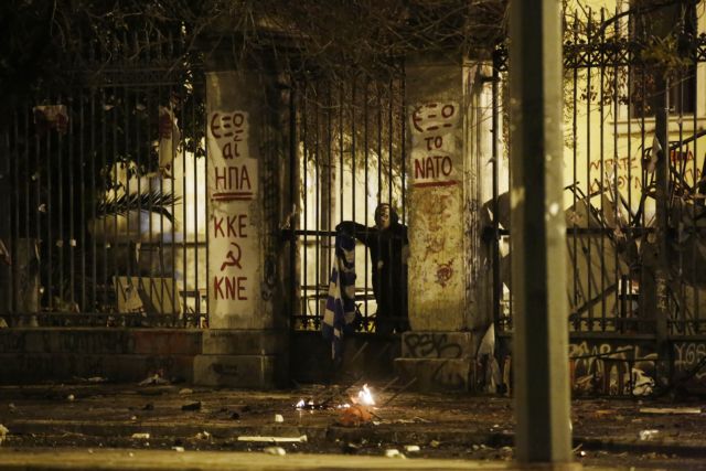 Λίγο πριν από τις οκτώ το βράδυ αντιεξουσιαστές επιχείρησαν με σιδηροτροχό να κόψουν τα κάγκελα την πύλης του Πολυτεχνείου.