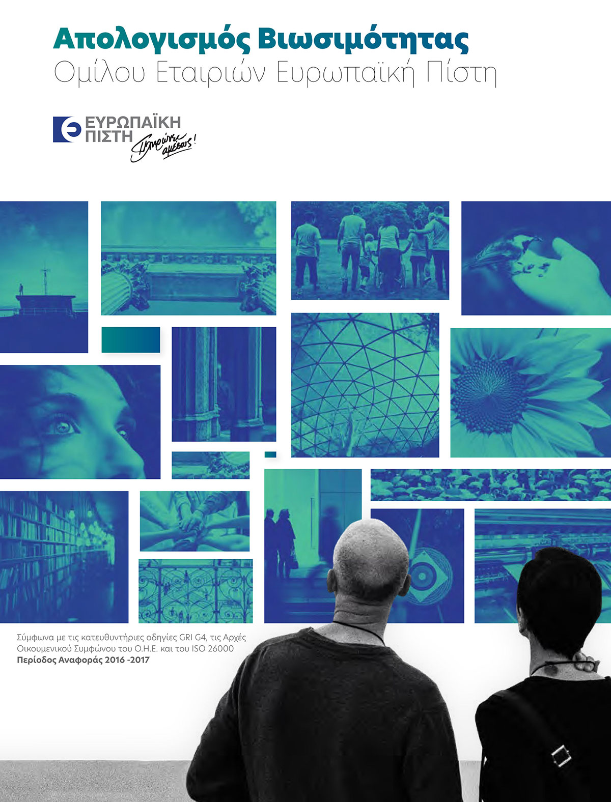 Ο Όμιλος Ευρωπαϊκή Πίστη προχώρησε σε δημοσίευση του Απολογισμού Βιωσιμότητας για τα έτη 2016 και 2017, σύμφωνα με τις κατευθυντήριες οδηγίες του GRI G4, τις Αρχές του Οικουμενικού Συμφώνου του Ο.Η.Ε. και του ISO 26000.