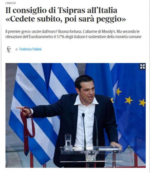 «Είναι αυτό που εννοεί ο Τσίπρας όταν καλεί τους Ιταλούς να αλλάξουν πορεία ώστε να μην αναγκαστούν στη συνέχεια και μετά από σημαντικές ζημιές να καταβάλλουν υψηλότερο τίμημα» αναφέρει η Corriere della Sera.