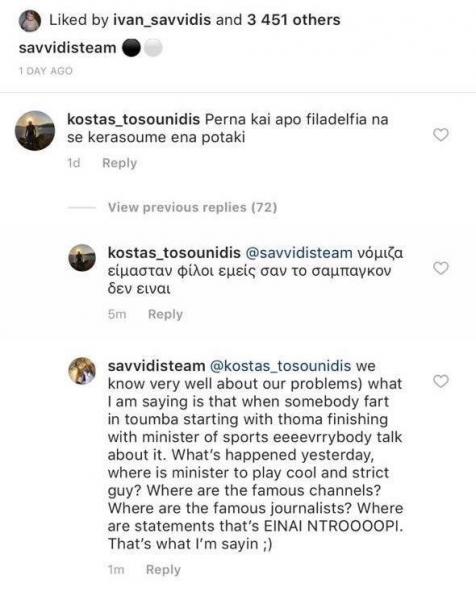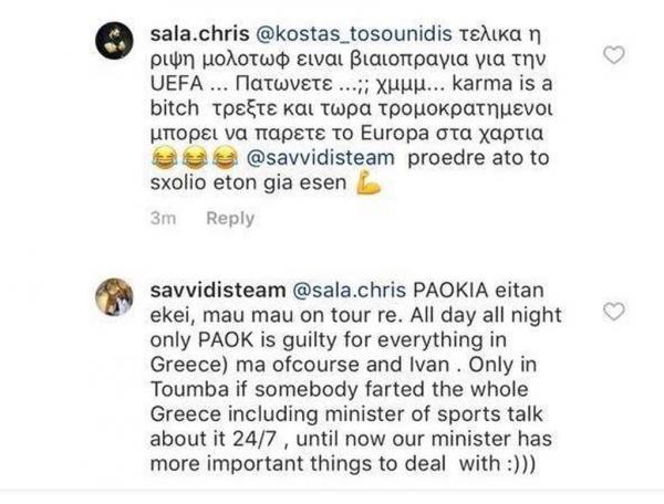 Λίγο αργότερα απάντησε σε νέο μήνυμα, αναφέροντας: «Γνωρίζουμε πολύ καλά για τα δικά μας προβλήματα. Αυτό που λέω είναι, ότι αν κάποιος κλ… στην Τούμπα, ξεκινάνε να μιλάνε από τον Θωμά μέχρι τον Υφυπουργό και τον καθένα. Τι έγινε χθες; Που είναι ο Υφυπουργός να το… παίξει χαλαρός και αυστηρός; Που είναι τα… γνωστά κανάλια; Που είναι οι… γνωστοί δημοσιογράφοι; Που είναι οι δηλώσεις ότι είναι ντροπή. Αυτό είναι που λέω».
