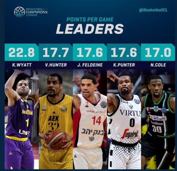 Την υπόλοιπη πεντάδα την συμπληρώνουν οι Τζέιμς Φελντέιν με 17,6 πόντους κατά μέσο όρο, όσους έχει και ο Κέβιν Πάντερ της Βίρτους Μπολόνια, ενώ ο Νόρις Κόουλ έχει 17 πόντους κατά μέσο όρο.