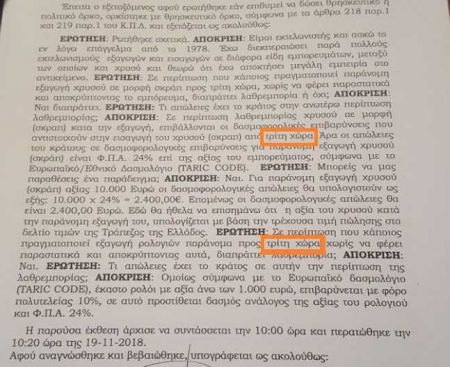 Στην κατάθεσή του, που παρουσιάζει «Το Βήμα», ο μάρτυρας ερωτάται από αστυνομικούς μόνο για τη δασμολόγηση του χρυσού για εξαγωγές προς «τρίτες χώρες» κι όχι για την ειδική περίπτωση της Τουρκίας και των διακρατικών συμφωνιών που υπάρχουν με την Ελλάδα κλπ. Αυτά που είχαν ζητηθεί στις προγενέστερες συναντήσεις για εκθέσεις, καταλογισμούς χρυσού κλπ ουδέποτε υπήρξαν.