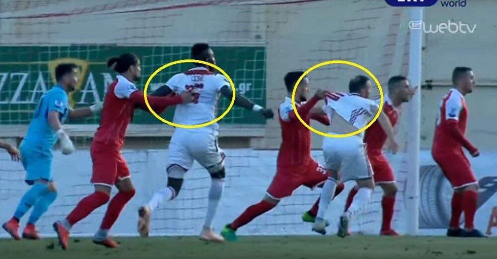 Υπάρχουν διάφοροι τρόποι να ζητήσεις τη… φανέλα ενός αντιπάλου. Η φάση του 41΄ενδεικτική. Ο Λισγάρας προσπαθεί να αρπάξει αυτή που φορά ο Σισέ, και ο Τοροσίδης νιώθει την ίδια απειλή απο τον Κασάδο.