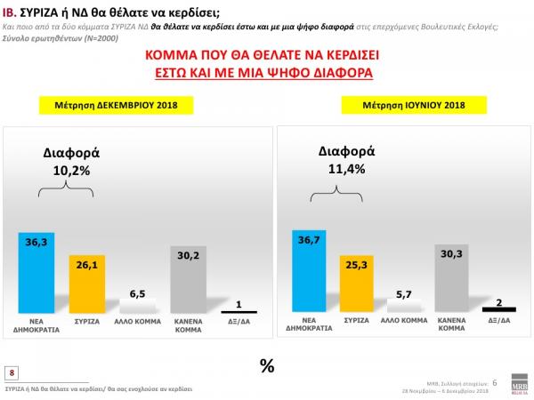 Στο ερώτημα ποιο από τα δύο κόμματα, ΣΥΡΙΖΑ ή ΝΔ, θα θέλατε να κερδίσει έστω και με μία ψήφο διαφορά στις επερχόμενες βουλευτικές εκλογές, το 36,3 % απαντά η ΝΔ, το 26,1% ο ΣΥΡΙΖΑ, ενώ το 30,2% κανένα κόμμα.