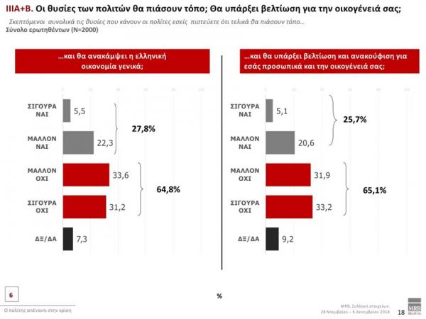 Στην ίδια δημοσκόπηση ποσοστό 64,8% απαντά «μάλλον όχι-σίγουρα όχι» στο ερώτημα αν «οι θυσίες των πολιτών θα πιάσουν τόπο και θα ανακάμψει η ελληνική οικονομία γενικά» με το 27,8% να απαντά «σίγουρα ναι-μάλλον ναι», ενώ στο ερώτημα «αν θα υπάρξει βελτίωση και ανακούφιση προσωπικά και για την οικογένειά τους», οι πολίτες απαντούν 65,1% «Μάλλον όχι και σίγουρα όχι» και 25,7% «Σίγουρα ναι-Μάλλον ναι».