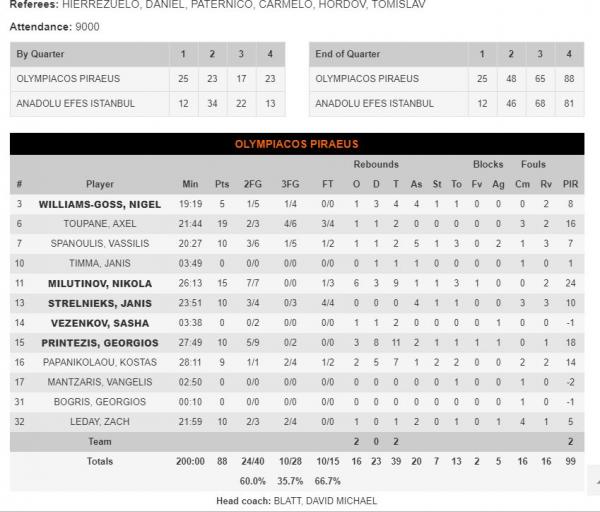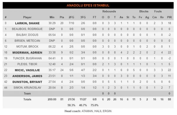 Για την Εφές, πρώτος σκόρερ ήταν εκπληκτικός φέτος Βασίλιε Μίσιτς με 24 πόντους, ενώ πολλά προβλήματα δημιούργησε ο Σέιν Λάρκιν με 20 πόντους.