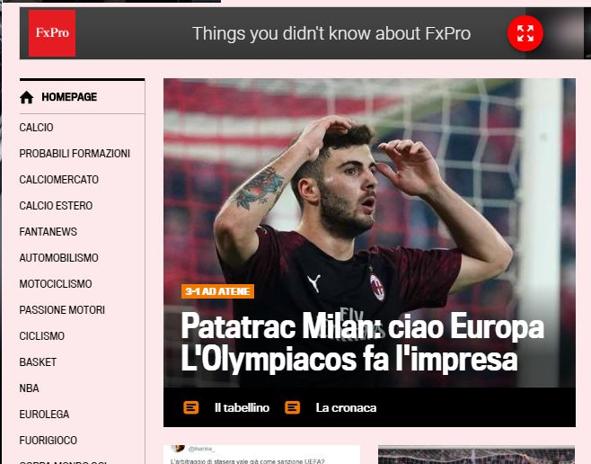 Η μεγάλη ιταλική εφημερίδα Gazzetta στην ηλεκτρονική της έκδοση έχει τίτλο:«Πατατράκ για τη Μίλαν: Αντίο Europa. Αποκλεισμός από τον Ολυμπιακό» και πρόσθέτει: «Οι ροσονέρι έχασαν την πρόκριση στο τελευταίο τρελό ημίωρο, διάστημα στο οποίο δέχθηκαν τρία γκολ. Το γκολ του Ζαπάτα δεν ήταν αρκετό»