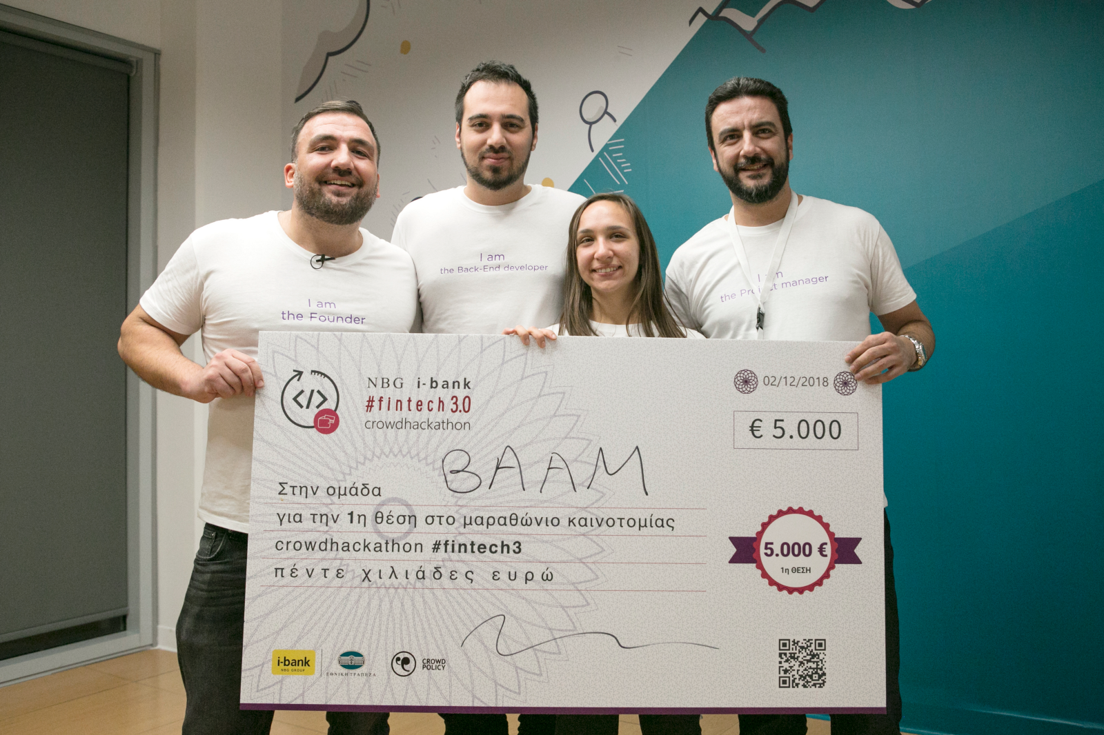 Το 1ο βραβείο και χρηματικό έπαθλο 5.000 ευρώ απονεμήθηκε στην ομάδα BAAM για την ανάπτυξη μιας πλατφόρμας διαχείρισης assets που χρησιμοποιεί τεχνολογίες blockchain, smart contracts και AI. Η πιλοτική εφαρμογή της ομάδας παρέχει τη δυνατότητα επιτάχυνσης των σημερινών διαδικασιών αγοραπωλησίας των assets με μια σειρά από καινοτόμες πρακτικές, όπως η ταυτοποίηση των αγοραστών (digital KYC βάσει eIDAS για ευρωπαίους πολίτες), η χρήση τεχνητής νοημοσύνης (AI) για την αποτίμηση των assets σε πραγματικό χρόνο και η εκκαθάριση των συναλλαγών βασισμένη σε smart contracts και open banking APIs.