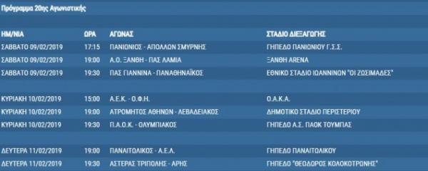 Στην 19η αγωνιστική (2-3/02) δεσπόζει το ντέρμπι της ΑΕΚ με τον ΠΑΟΚ, που θα διεξαχθεί το ΟΑΚΑ την Κυριακή 3 Φεβρουαρίου στις 19:30. Την ίδια μέρα στις 17:15 ο Παναθηναϊκός θα παίξει στην Βοιωτία απέναντι στον Λεβαδειακό, ενώ ο Ολυμπιακός θα αγωνιστεί το απόγευμα του Σαββάτου (19:30) στο Καραϊσκάκη με τον Πανιώνιο.