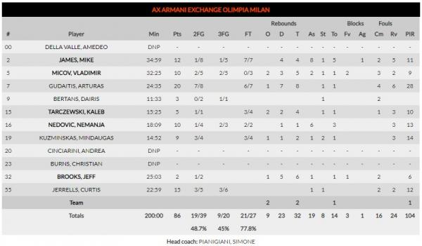 Από την Αρμάνι οι Γκουντάιτις (20π, 8 ρ.), Τζέρελς (15π.) και Μίτσοβ (10π.) ήταν οι καλύτεροι, ενώ ο Τζέιμς είχε 12π. με 1/8 διπ, 1/5τριπ. Από τον Παναθηναϊκό, που τουλάχιστον είχε διάθεση να παλέψει οι Καλάθης (24π. 11ας) και Παππάς (13π.) προσπάθησαν.