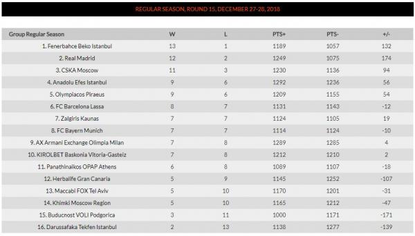 Αναλυτικά πώς διαμορφώθηκε η βαθμολογία με την πρώτη ημέρα της 15ης αγωνιστικής της Euroleague συμπληρωμένη: