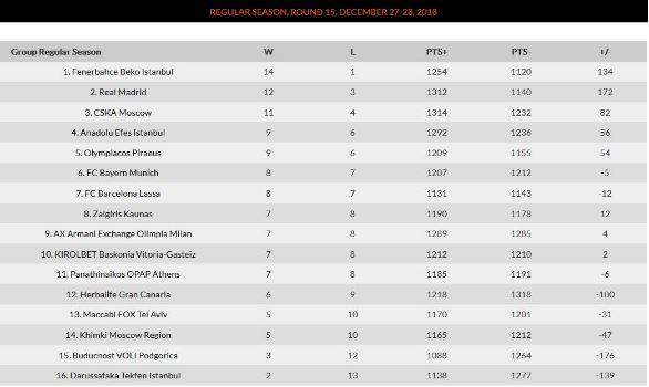 Με τη μεγάλη νίκη του Παναθηναϊκού επί της ΤΣΣΚΑ Μόσχας (96-84) να δεσπόζει, ολοκληρώθηκε το δεύτερο μισό της 15ης και τελευταίας αγωνιστικής του πρώτου γύρου της Euroleague.