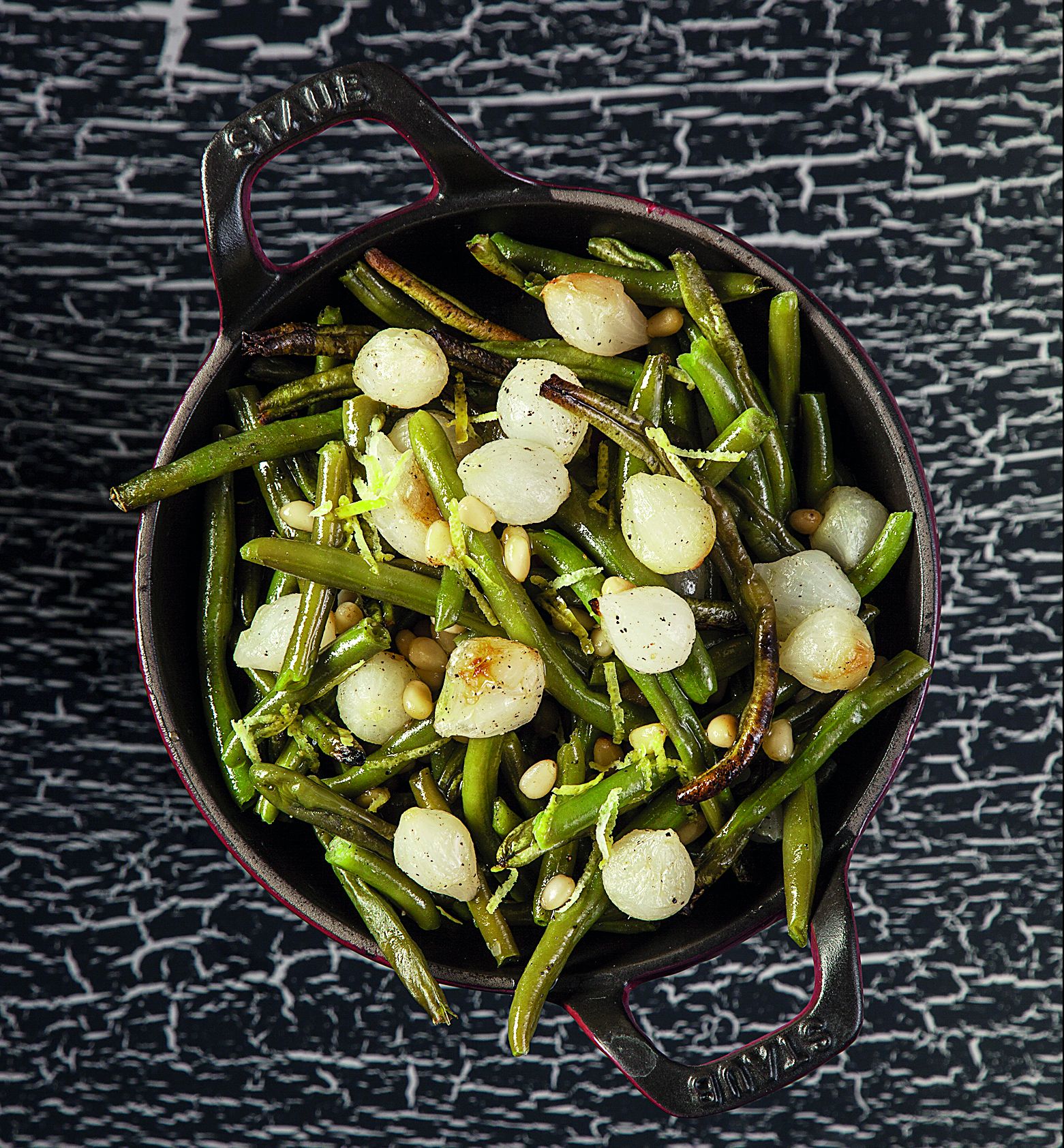 Βγάζουμε το ταψί από τον φούρνο, πασπαλίζουμε τα φασολάκια με το ξύσμα και τα κουκουνάρια, ανακατεύουμε καλά και σερβίρουμε.