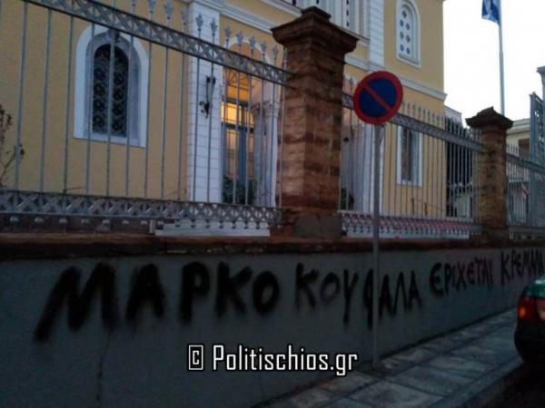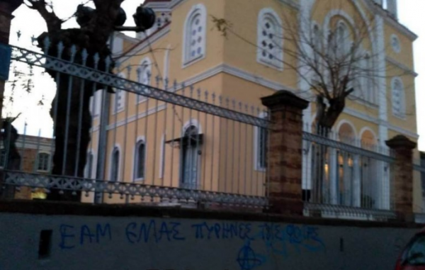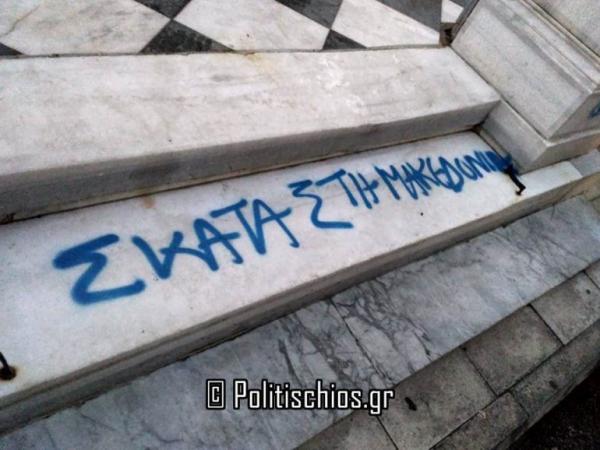 Με συνθήματα κατά του Μητροπολίτη Χίου Μάρκου και όσων εναντιώνονται στη συμφωνία των Πρεσπών, βεβήλωσαν άγνωστοι τον Μητροπολιτικό Ναό των Αγίων Βικτώρων της πόλης της Χίου τα ξημερώματα της Κυριακής.