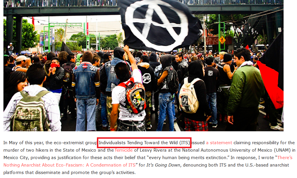 Σε δολοφονίες ανυποψίαστων ανθρώπων που περπατούσαν σε δασικές εκτάσεις, αλλά και σε βομβιστικές επιθέσεις σε λεωφορεία, κυρίως στην νότια Αμερική, έχουν προχωρήσει μέλη της ιδιόμορφης, ακραίας διεθνούς οργάνωσης «ακτιβιστών» ITS (Ατομικιστές που τείνουν στο άγριο ) –«Εικονοκλαστική Σέχτα» που ανέλαβε την ευθύνη για την βομβιστική επίθεση, στις 27 Δεκεμβρίου 2018, στην εκκλησία του Αγίου Διονυσίου στο Κολωνάκι!