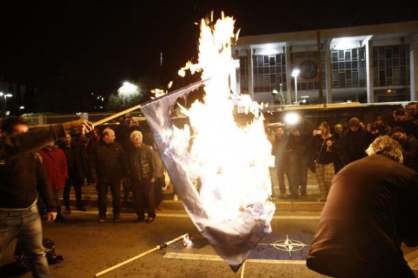 Αμέσως μετά τη συγκέντρωση ξεκίνησε πορεία προς την αμερικάνικη πρεσβεία. Όταν η κεφαλή της πορείας έφτασε έξω από την πρεσβεία, οι διαδηλωτές έκαψαν σημαίες του ΝΑΤΟ, των ΗΠΑ και της ΕΕ.