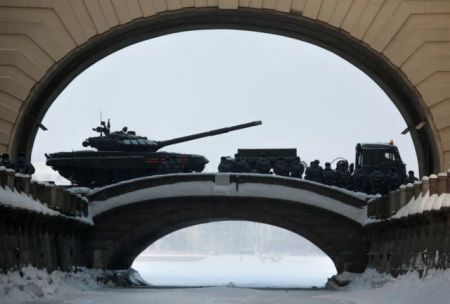 Περισσότεροι από 2.500 στρατιώτες και άνδρες των δυνάμεων ασφαλείας συμμετείχαν στην παρέλαση, αυτή, κοντά στο Μουσείο του Ερμιτάζ, κατά την οποία παρουσιάστηκαν επίσης το θρυλικό σοβιετικό άρμα T-34, διάφορα τεθωρακισμένα οχήματα, εκτοξευτήρες ρουκετών, το αντιπυραυλικό σύστημα S-400 και συστοιχίες πυραύλων Iskander-M.