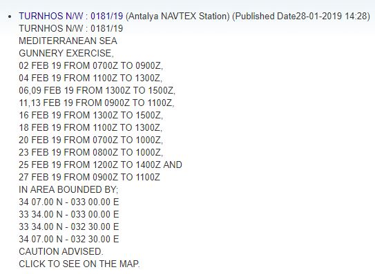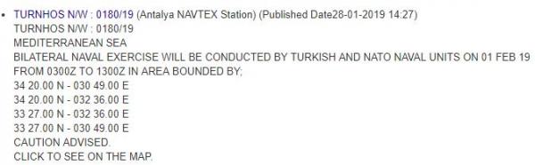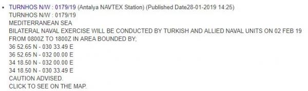 Επίσης με άλλη Navtex 179/19 η Τουρκία αναγγέλλει άσκηση για τις 2 Φεβρουαρίου η οποία θα διεξαχθεί από τουρκικές και «συμμαχική» ναυτική μονάδα στην περιοχή η οποία καλύπτει όλη την θαλάσσια περιοχή δυτικά της Κύπρου στα όρια της ΑΟΖ της μέχρι και την τουρκική ακτή.