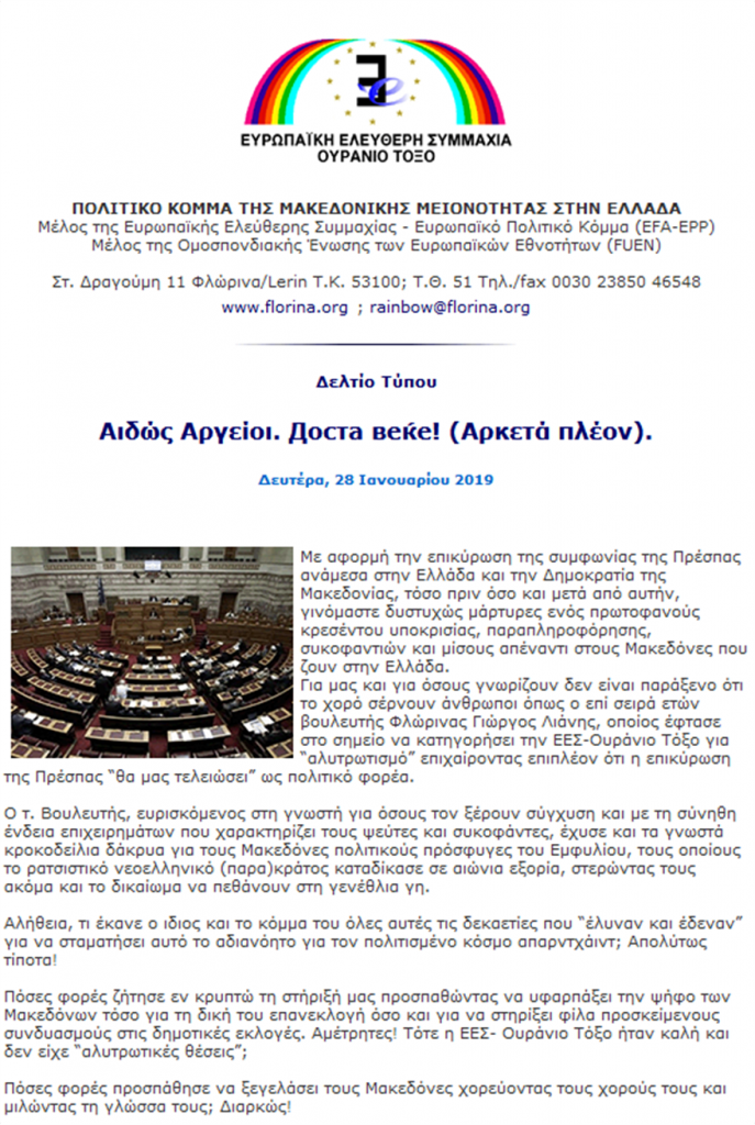 Στην ανακοίνωση, που δημοσιεύθηκε τη Δευτέρα και τιτλοφορείται «Αιδώς Αργείοι Доста веќе!» (Αρκετά πλέον) εξαπολύεται σφοδρή επίθεση και στον πρώην υπουργό και βουλευτή του ΠΑΣΟΚ, Γιώργο Λιάνη, αλλά και τον δήμαρχο Φλώρινας, Ιωάννη Bοσκόπουλο, «που πρωτοστατεί χωρίς ντροπή στη σταυροφορία συλλογής υπογραφών για “την ελληνικότητα της Μακεδονίας”».