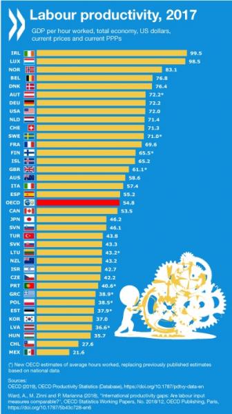 Σύμφωνα με τα στοιχεία του ΟΟΣΑ για το 2017, η Ελλάδα καταλαμβάνει μόλις την 29η θέση σε σύνολο 36 κρατών στην παραγωγικότητα εργασίας, που μετράται ως η ακαθάριστη προστιθέμενη αξία ανά ώρα εργασίας.