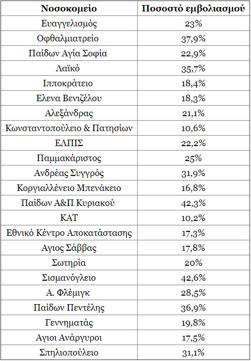 Τα ποσοστά εμβολιασμού υγειονομικών ανά νοσοκομείο όπως τα δημοσιοποίησε η ΠΟΕΔΗΝ: