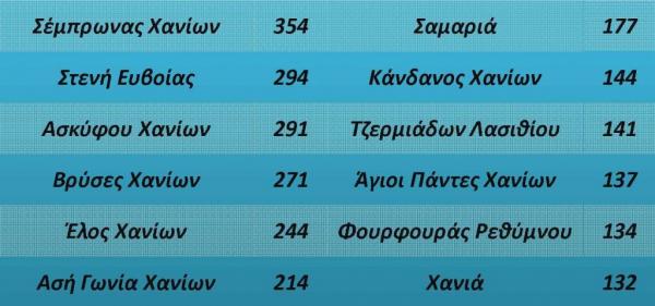 Συγκεκριμένα, η περισσότερη βροχή έπεσε στο Σέμπρωνα Χανίων (354 χιλιοστά μέσα σε τέσσερις μέρες), στη Στενή Ευβοίας (294), στο Ασκύφου Χανίων (291), στις Βρύσες Χανίων (271) και στο Έλος Χανίων (244).