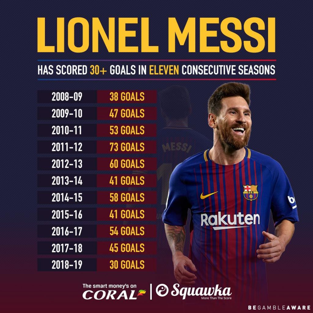 Ο Λίο… των θαυμάτων βρήκε δίχτυα για πέμπτο σερί εντός έδρας παιχνίδι και το εν λόγω τέρμα μάλιστα ήταν το υπ’αριθμόν 30! Αριθμό που φτάνει για 11η σερί σεζόν… Πιο αναλυτικά φέτος σε συνολικά 30 συμμετοχές σε όλες τις διοργανώσεις, ο Μέσι έχει σκοράρει 22 στο πρωτάθλημα, 6 στο Champions League και 2 στο Copa del Rey.