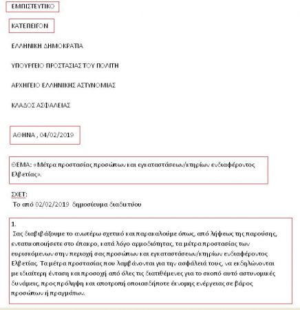 Στους αστυνομικούς των Υπηρεσιών σας που διατίθενται για την υλοποίηση των μέτρων προστασίας των προαναφερθέντων (προσώπων και εγκαταστάσεων/κτηρίων), να δοθούν οι δέουσες εντολές και οδηγίες για τον τρόπο εκτέλεσης των καθηκόντων/αποστολής τους και προκειμένου να αναφέρουν άμεσα οποιοδήποτε περιστατικό ήθελε υποπέσει στην αντίληψή τους και στρέφεται κατά της ασφάλειάς τους». Κι αυτός λοιπόν ο… συναγερμός της ΕΛΑΣ για επίθεση σε ελβετικό στόχο, οδήγησε στην ανεμπόδιστη εισβολή του «Ρουβίκωνα» στην πρεσβεία της εν λόγω χώρας. Προκαλώντας νέα ερωτήματα για την εικόνα διάλυση της ΕΛΑΣ.