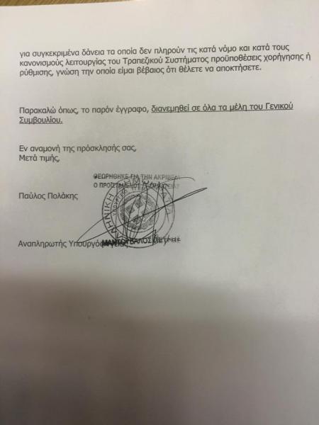 Επιστολή στον Διοικητή της Τράπεζας της Ελλάδος, Γιάννη Στουρνάρα έστειλε ο αναπληρωτής υπουργός Υγείας, Παύλος Πολάκης, με την οποία του ζητά να παρευρεθεί στο επόμενο Διοικητικό Συμβούλιο της ΤτΕ προκειμένου να τους ενημερώσει για δάνεια τα οποία σε αντίθεση με το δικό του, «δεν πληρούν τις κατά νόμο και κατά κανονισμούς λειτουργίας του τραπεζικού συστήματος προϋποθέσεις χορήγησης ή ρύθμισης».