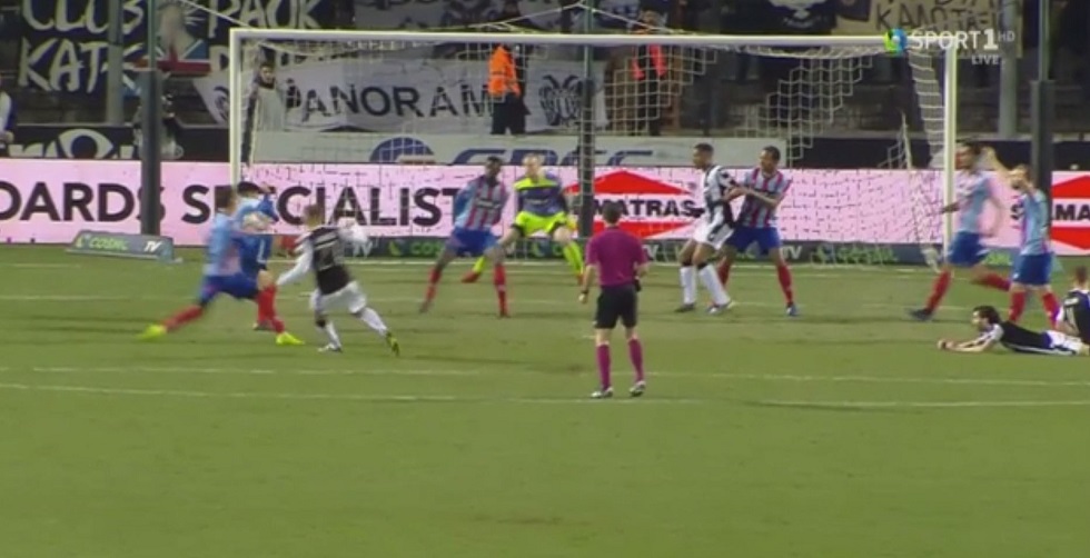 Συγκεκριμένα, η μπάλα στρώθηκε στον Μίσιτς, ο Πορτογάλος μέσος σούταρε και η μπάλα χτύπησε στα πλευρά του Μανθάτη, με τον Σκουλά να δείχνει την άσπρη βούλα, μετά την υπόδειξη της βοηθού του, Χρυσούλας Κουρομπύλια.