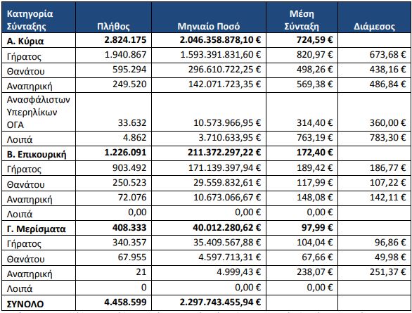 Η μηνιαία δαπάνη που κατέβαλαν τα Ταμεία ανήλθε στα 2.297.743.455,94 ευρώ και περιλαμβάνει τις κρατήσεις φόρου, τις κρατήσεις υπέρ υγείας και ΑΚΑΓΕ, ενώ δεν περιλαμβάνει την παροχή ΕΚΑΣ.