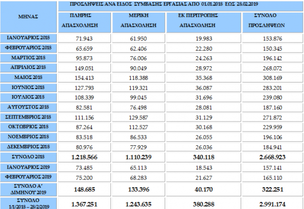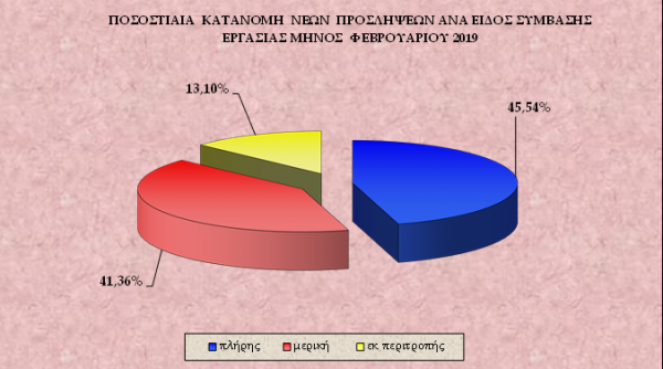 Με ευέλικτες μορφές εργασίας συνεχίζονται οι περισσότερες νέες προσλήψεις και τον Φεβρουάριο του 2019, μήνας κατά τον οποίο εφαρμόστηκε η αύξηση του κατώτατου μισθού κατά 11%.