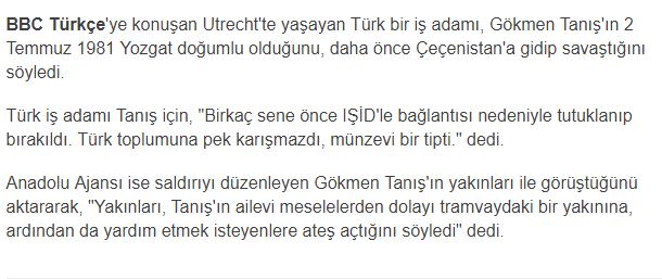 Τούρκος επιχειρηματίας, ο οποίος ζει στην ολλανδική πόλη και γνώριζε τον δράστη, μιλώντας στην τουρκική υπηρεσία του BBC, τόνισε ότι ο Τανίς που γεννήθηκε στις 2 Ιουλίου 1981, στο παρελθόν είχε πολεμήσει στην Τσετσενία.